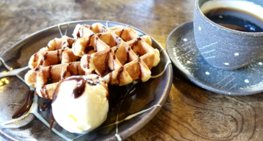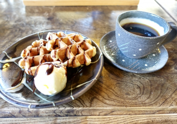 優しい甘味のワッフルにチョコレートソースを添えて。