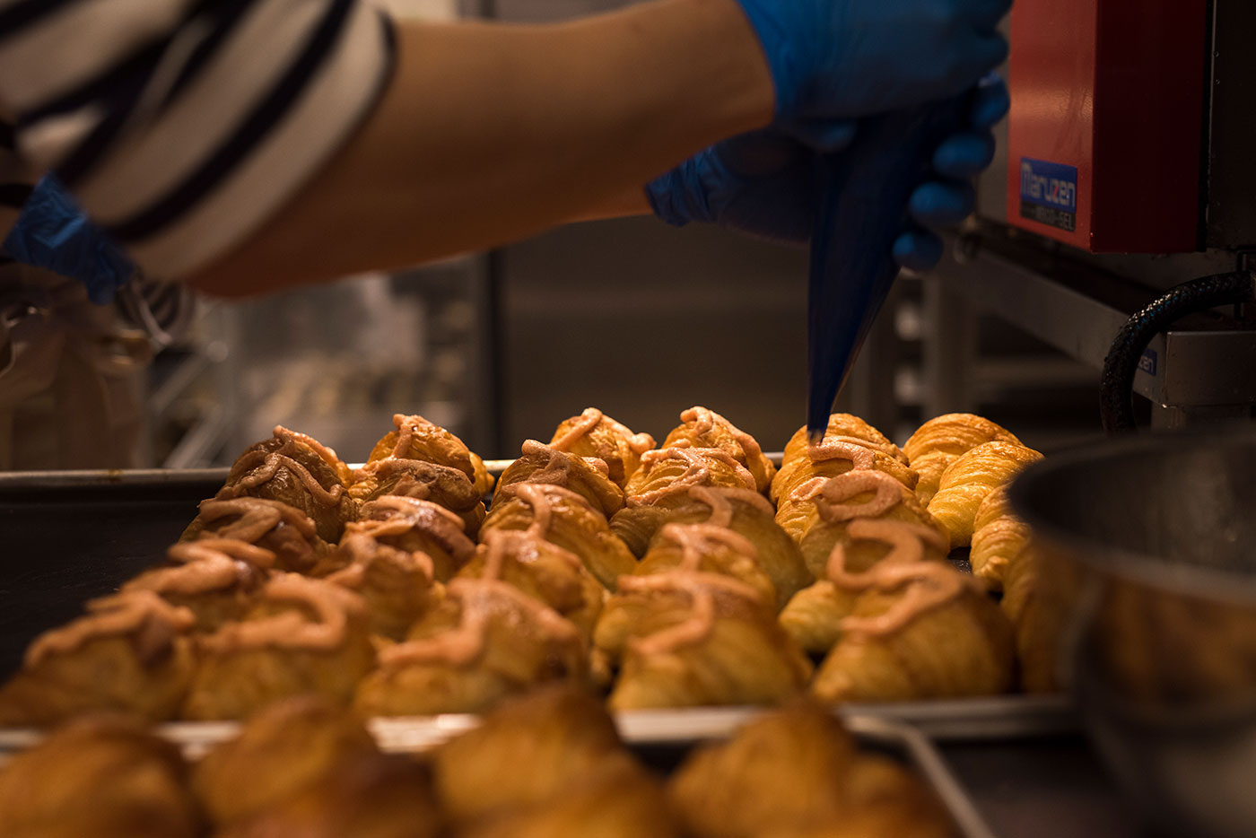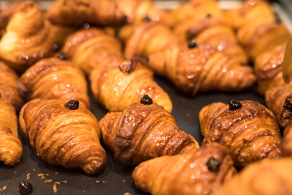 ミニヨンのクロワッサンは食感に徹底的にこだわり、 機械では再現できない食感を出すために創業以来ずっと手作業で、 クロワッサン生地を折る“手折り製法”で生地を作っており、 “外はサクッと、中はモチッと“2つの食感が味わえます。