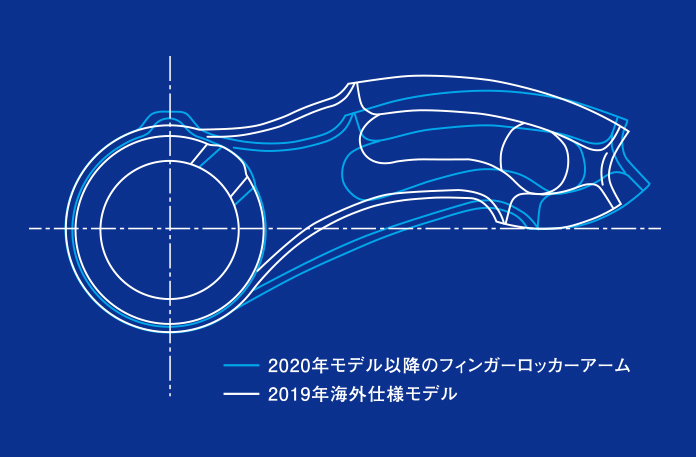 カムプロフィールとフィンガーロッカーアームのプロフィールの合計によってバルブの最大リフト量が決まり、リフト量を確保しやすいフィンガーロッカーアーム式バルブシステム。各プロフィールの最適化により、超高回転におけるバルブ開閉時の衝撃緩和が可能で、ハイパフォーマンスエンジンの礎となっている。さらに、フィンガーロッカーアームの形状を最適化することで、高回転域でのバルブ開閉時の挙動をより安定。また、IN、EXともにカムプロフィールを調整し、実績のあるバルブリフト量とオーバーラップを継承。高回転域でのバルブ追従性を高めている。