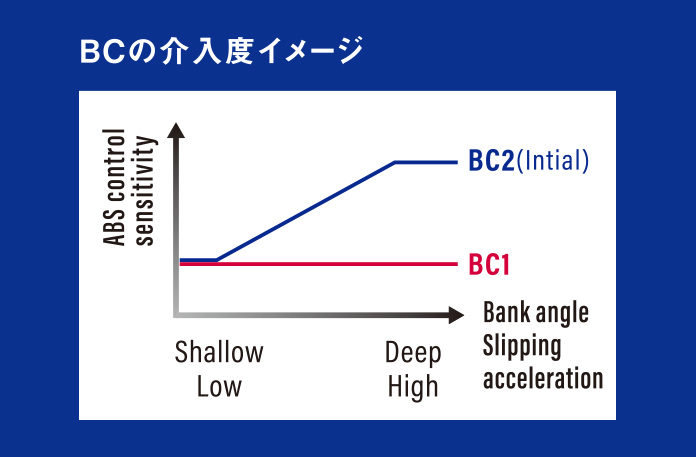 前輪速度、後輪速度、6軸IMUの各情報をHU(ハイドロユニット。ABSユニットを含む)に集約して逐次演算し、前後輪のブレーキ圧力に反映させる。介入度は2パターンからセレクト可能。直進走行状態での緊急制動に対応する通常ABS※モードの「BC1」、さらにコーナリング中のやむを得ない緊急制動時など車両挙動が乱れやすい場面においてもブレーキ圧を制御する「BC2」を用意している。