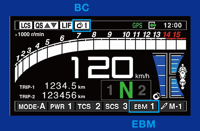 ギアポジション、エンジン回転数、アクセルポジション、スロットルポジションの情報に基づき、ECU(エレクトリックコントロールユニット)が①スロットル開度、②点火時期、③燃料供給量を制御。扱いやすいエンジンブレーキ特性を実現する。EBMは3段階から介入度合いをセレクト可能。好みや走行状況に応じた最適なエンジンブレーキを選択できる。