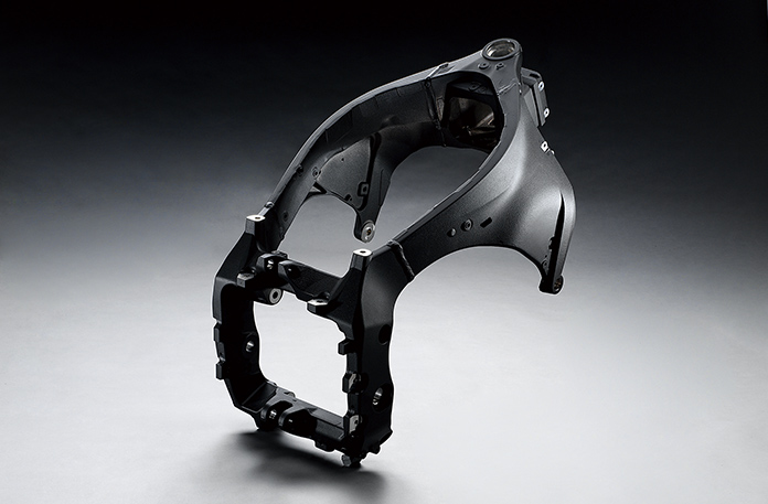 ハードブレーキングによる強力なストッピングパワーを、難なく受け止める。倒し込みのフィーリングはあくまでもニュートラル。狙ったバンク角に、狙ったバンキングスピードで持ち込める。コーナリング中は高い自由度でラインを変更でき、立ち上がりでは不安なくフルパワーを堪能できる。高剛性でありながら、縦・横・ねじりの最適バランスに配慮したアルミ製デルタボックスフレームとリアアームの組み合わせが、俊敏でありながら安定感・安心感のあるハンドリングをもたらす。