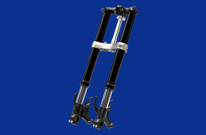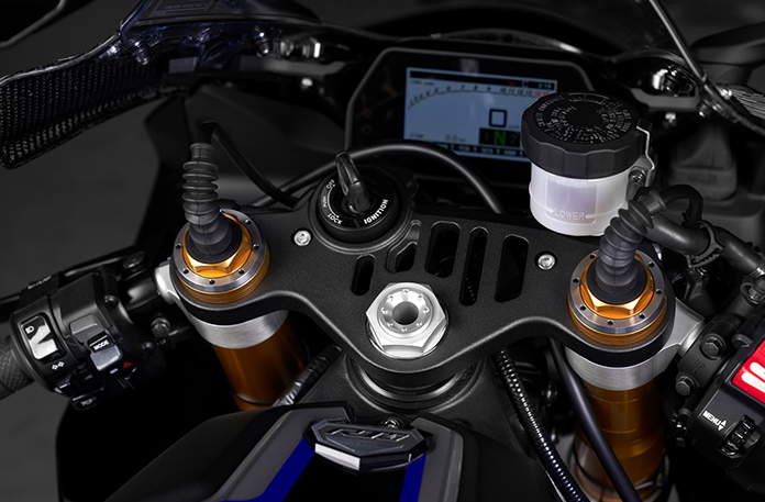 高剛性な倒立式フロントサスペンションは、120mmのストローク量を確保。最適な減衰力およびばね特性を設定しており、路面をつかむ感触がダイレクトに伝わる豊かな接地感と、ハンドリングのニュートラルさ・軽快感に寄与している。また、YZF-R1Mは前後サスペンションを統合制御するオーリンズ製電子制御サスペンション・ERS(エレクトリックレーシングサスペンション)を搭載。フロントアクスルブラケット部にガスシリンダーを装備し、0.6MPa加圧することでキャビテーションの発生を抑制。高負荷時でも安定した減衰力を発揮する。