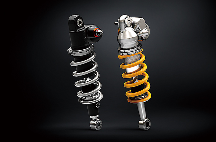 走行状況に応じて伸側・圧側減衰力を統合制御するオーリンズ製電子制御サスペンションを前後に搭載。フロントサスペンションにはガスシリンダーを装備