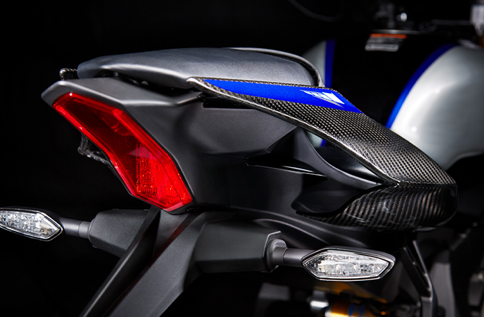 ロードレースの最高峰、MotoGP。パフォーマンスとスピードを極めたヤマハMotoGPマシン・YZR-M1は、ダイナミックでありながら凜とした麗しい空気感を放つ。YZF-R1にもそのデザインスピリッツは余すことなく受け継がれている。M字センターエアダクトやインテグレートされたカウリングは、エンジンパワーや空力特性に直結した機能性をベースとしながら、レーシングマシンならではのソリッドな魅力を感じさせる。YZF-R1のボディカラーには、マットブルーとのコンビネーションによりレースシーンを彷彿させるブルーと、ソリッドのブラックを採用することでモダンさを演出したブラックの2色を設定。どちらのカラーリングにもアクセントとしてシアンをロゴに配している。YZF-R1Mはカウルのカーボンとタンクのアルミ素材を活かしたカラーリング。リアアームもアルミ・バフ仕上げとすることで、高い質感を表現している。