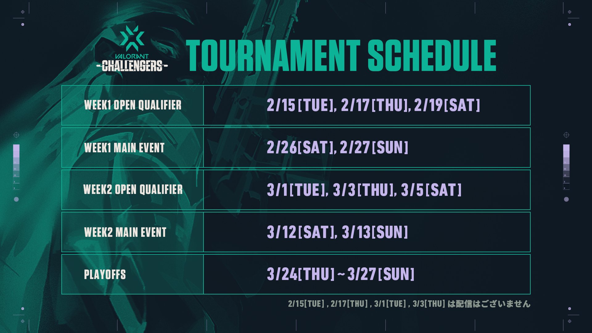 VCTの全体の流れは2月~3月にCHALLRNGERSで勝ち進んだチームが4月に行われるmastersに出場しそのmastersで勝ち進んだチームがChampionsに出場できる。また、同じ動きを5月~6月にCHALLRNGERS勝ち進んだチームが7月に行われるmastersに出場する。8月に行われるLast Chance Qualifier (通称LCQ)はChampionsへの最後の挑戦権となっている。